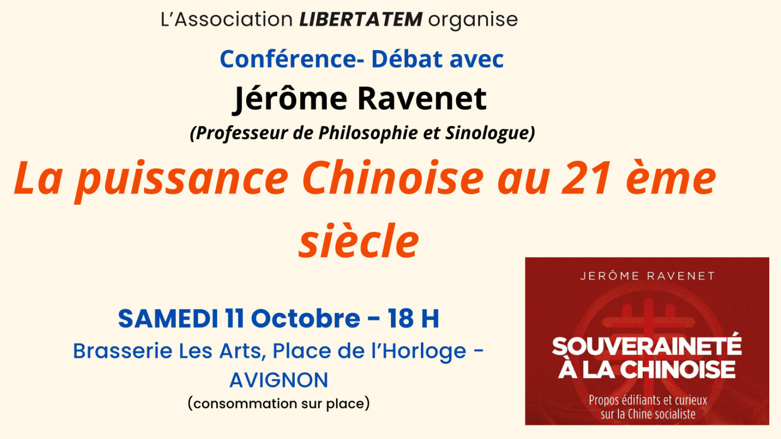 Le professeur de philosophie et sinologue, Jérôme Ravenet qui nous parlera de l’avenir de la Chine, que ce soit dans sa dimension politique, économique et internationale.